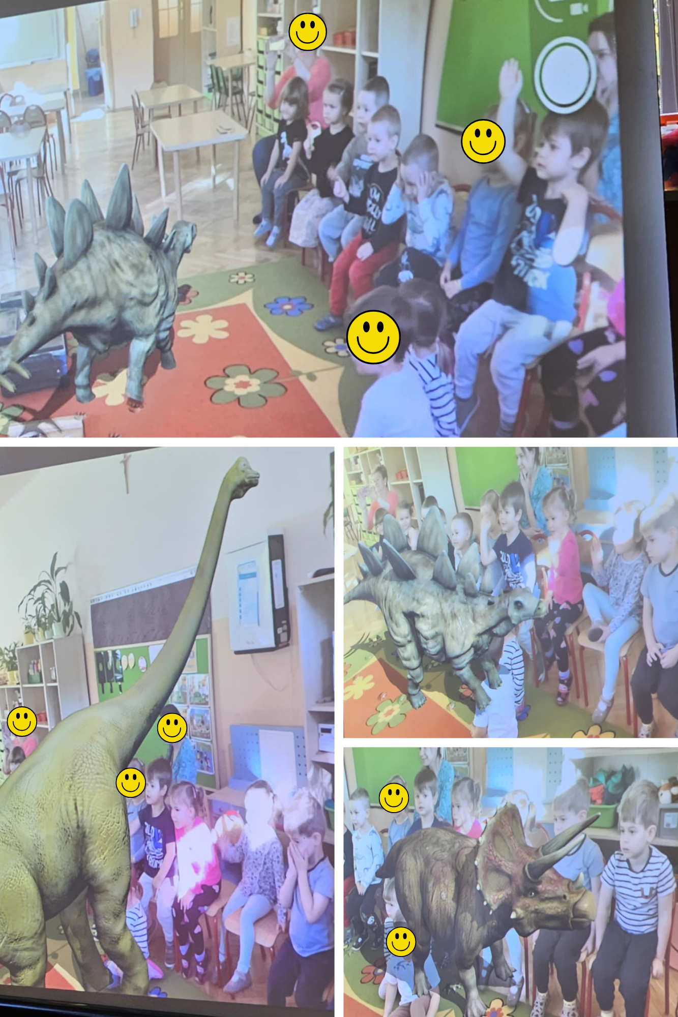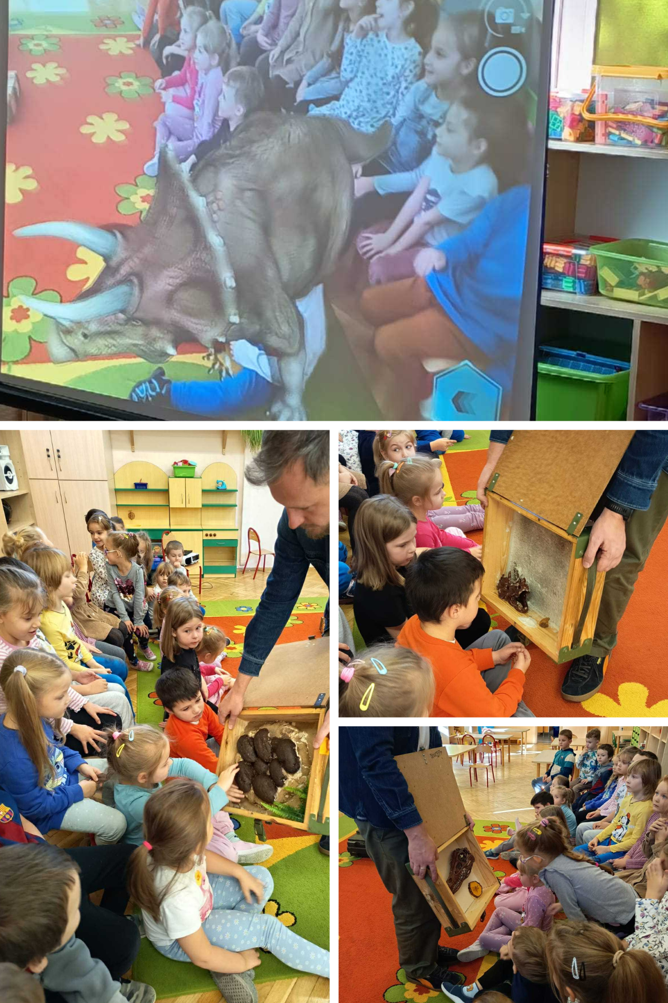 23 października wszystkie grupy przedszkolne uczestniczyły w warsztatach przyrodniczych pt.,,Dinozaury w przedszkolu”. Prowadzący podczas warsztatów zabrał nasze przedszkolaki w cudowną podróż po krainie dinozaurów. Przygotowane i zaprezentowane pomoce dydaktyczne, skompletowane eksponaty pozwoliły, aby dzieci poczuły się jak prawdziwi paleontolodzy. Prowadzący warsztaty pięknie opowiadał, angażując dzieci do aktywnego uczestnictwa. Na koniec zajęć została przeprowadzona projekcja "Żywych Dinozaurów". Ożyły one dzięki specjalnemu oprogramowaniu i wykorzystaniu nowoczesnych technik audiowizualnych, które pozwoliły przenieść dinozaury do otaczającej nas rzeczywistości, a dzieciom poczuć się jak w parku jurajskim. Dziękujemy za wspaniałe spotkanie i niesamowite przeżycia!