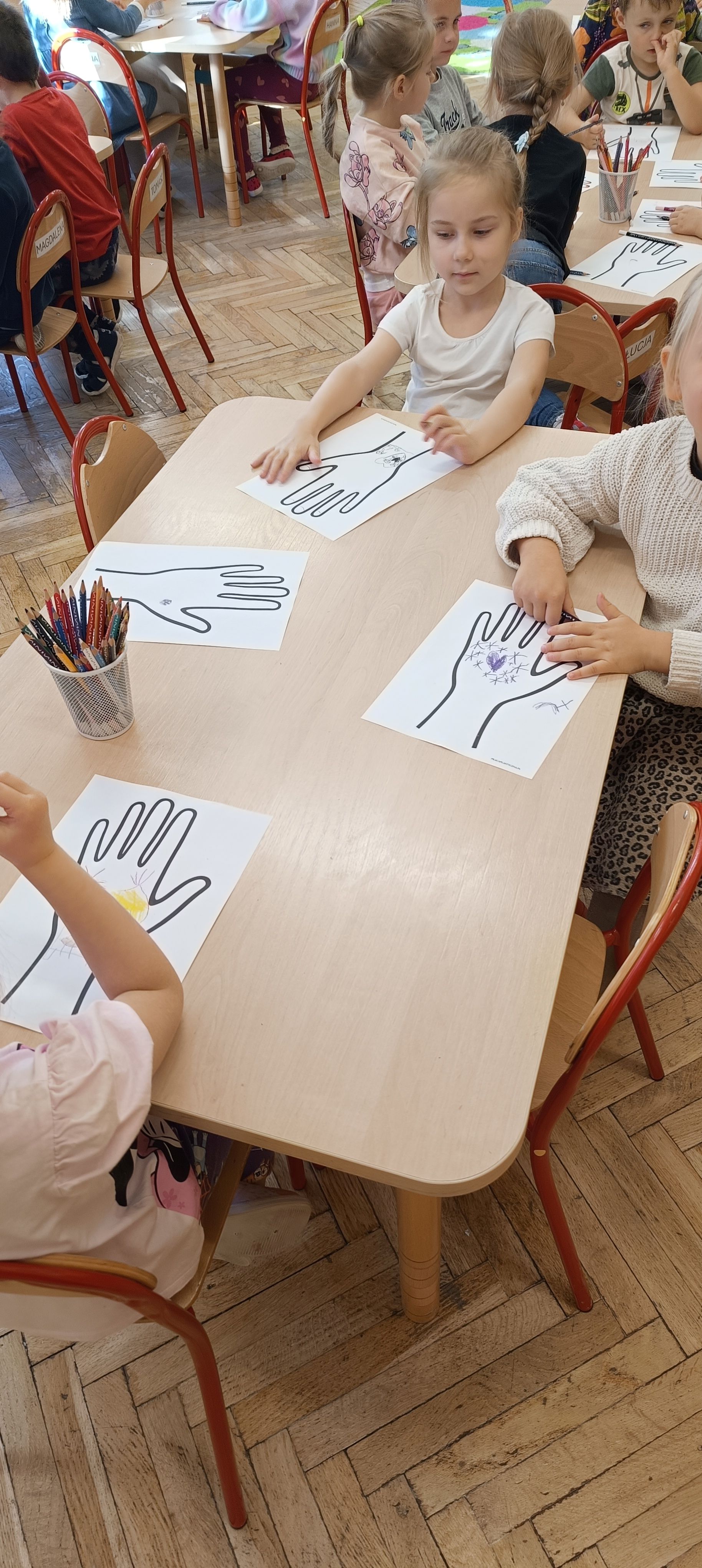 Na zakończenie każde dziecko otrzymało rysunek dłoni, w której wnętrzu narysowało rzeczy miłe,
