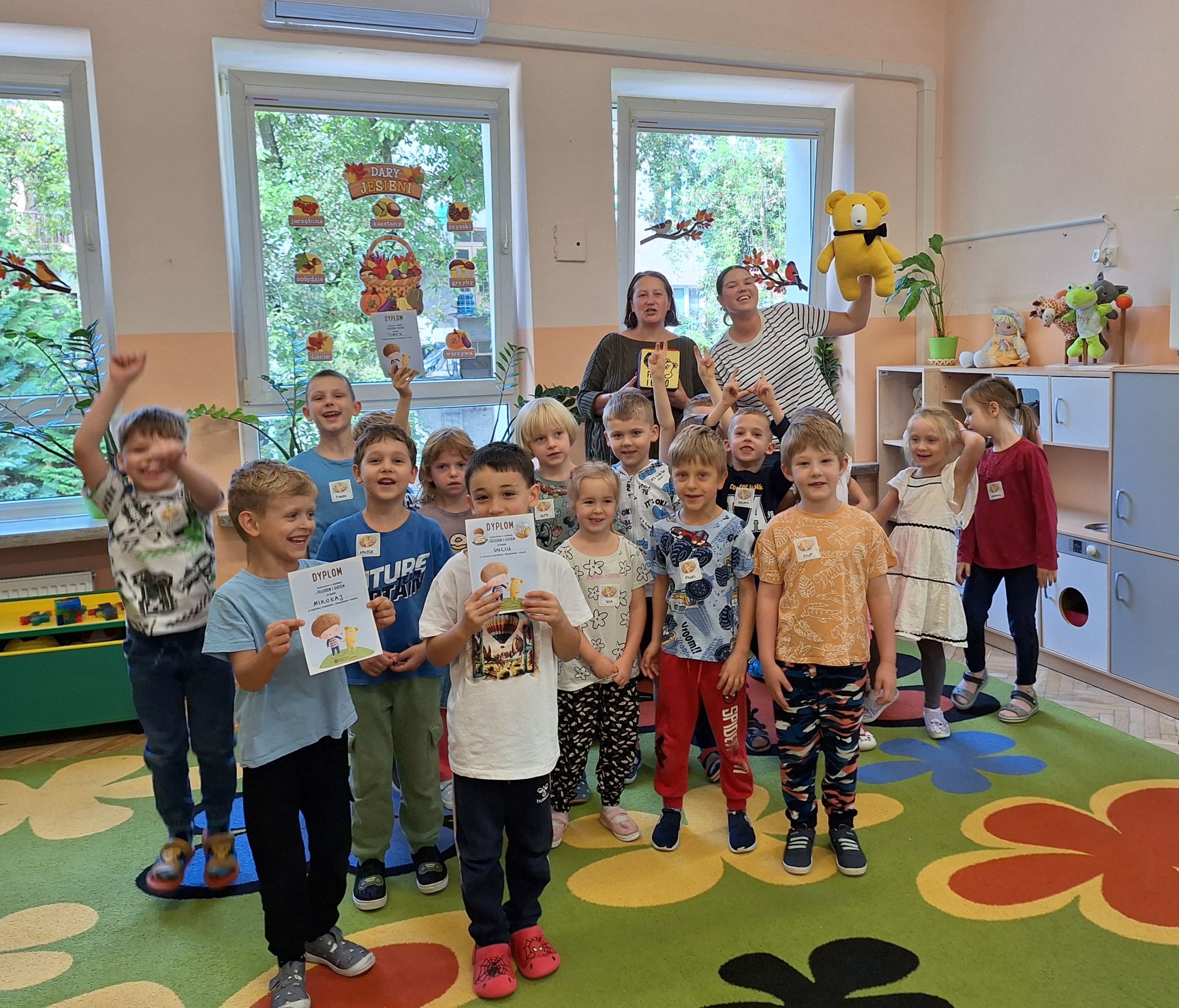 Dnia 11 września dzieci z grupy Niedźwiadki, Kangurki, Tygryski i Biedronki wzięły udział w warsztatach promujących serię „Feluś i Gucio”. Seria ta zawiera wiele ciekawych historii, które pomagają dzieciom rozwijać kompetencje emocjonalno-społeczne. Razem z sympatyczną maskotką Gucia, przedszkolaki uczyły się rozpoznawać i nazywać emocje oraz poznawały różne zawody i tajemnice ludzkiego ciała. Pretekstem do rozmowy z dziećmi o emocjach była również gra z wykorzystaniem kolorowej kostki. Wzbudziła ona duże zainteresowanie i uśmiechy na twarzach dzieci. Na sam koniec przedszkolaki otrzymały pamiątkowe dyplomy za wyjątkową kreatywność i zaangażowanie.