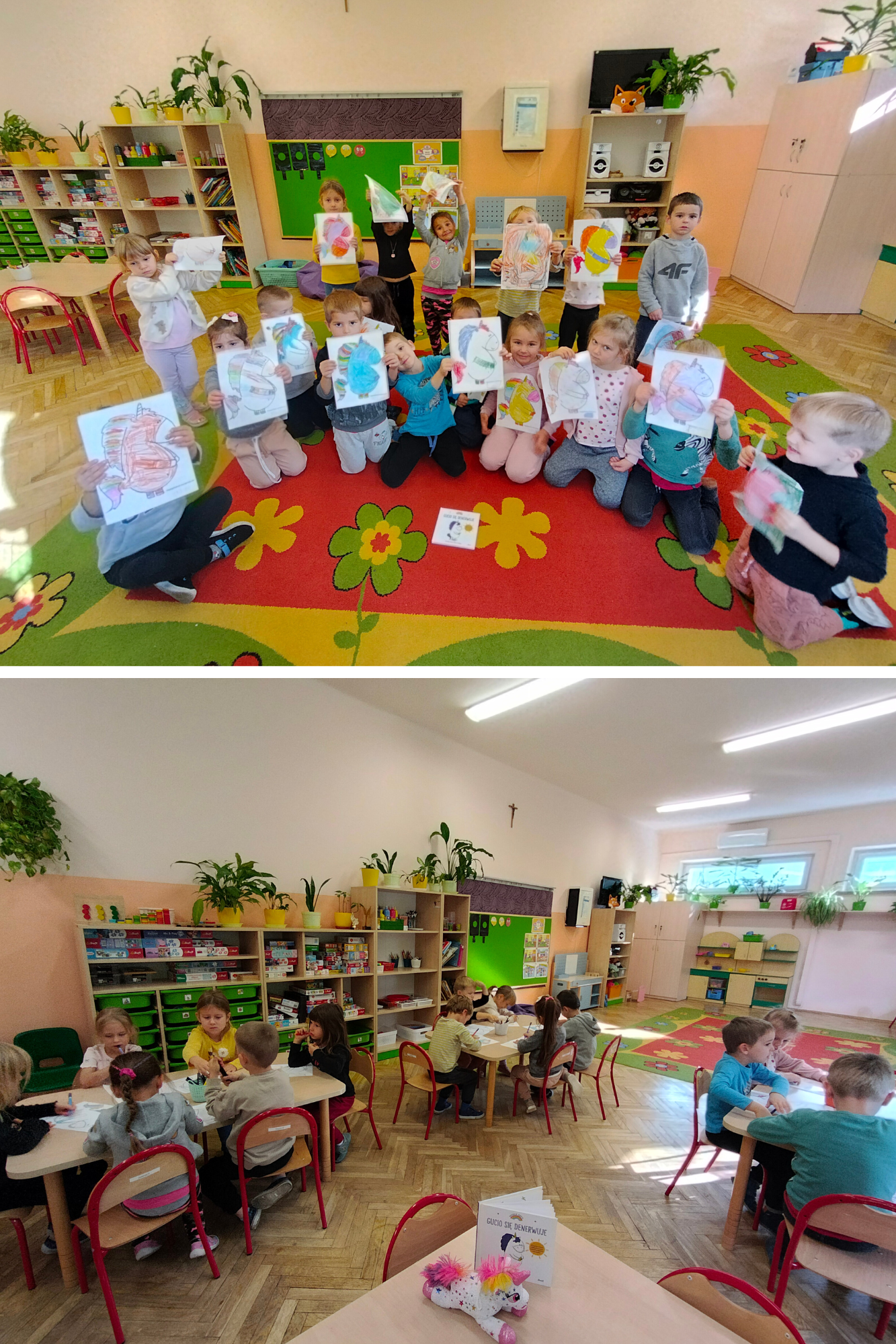 5 października, w ramach Tygodnia Budowania Relacji oraz Przeciwdziałania Przemocy Rówieśniczej, w grupie Kangurków odbyły się warsztaty z panią psycholog. Dzieci spotkały się z Guciem, którego grzywa zmienia kolor zależnie od jego nastroju. Tym razem była granatowa - Gucio był zdenerwowany. Kangurki z zaciekawieniem wysłuchały historii i dowiedziały się, dlaczego Gucio czuł się tak źle. Zbudowały również bańkę, która chroni przed przykrymi słowami, ale jednocześnie przepuszcza rady i słowa ludzi, którzy nas kochają i chcą dla nas jak najlepiej. Dzięki warsztatom dzieci nauczyły się, że nie warto brać do siebie złośliwych komentarzy. Na końcu Kangurki wykonały prace plastyczne przedstawiające sympatycznego jednorożca. Warsztaty były również pierwszym spotkaniem z Guciem w ramach Międzynarodowego Projektu Edukacyjnego „Kolorowe Uczucia Gucia" - ciąg dalszy nastąpi!