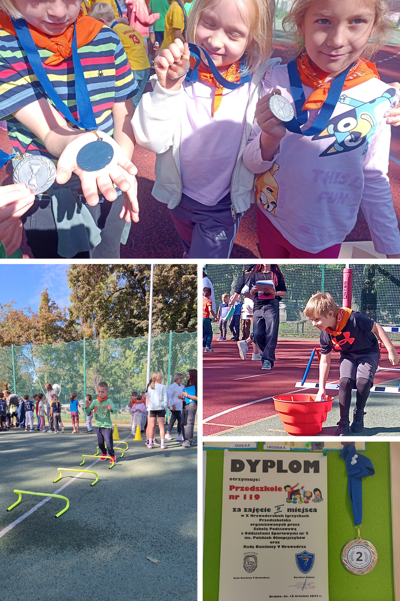 18 września grupa „Biedronki”, jako reprezentacja naszego przedszkola, uczestniczyła w X Igrzyskach Przedszkolaka , których organizatorem była Szkoła Podstawowa z oddziałami Sportowymi Nr 5 im. Polskich Olimpijczyków . W rywalizacji sportowej z pięcioma krowoderskimi przedszkolami wzięła udział dziesięcioosobowa drużyna, a pozostałe dzieci wytrwale dopingowały kolegów i koleżanki. Nasze wspaniałe „Biedronki” dały z siebie wszystko i zdobyły zaszczytne drugie miejsce, za które otrzymały srebrne medale oraz ciekawe nagrody. Przed ogłoszeniem wyników przedszkolaki obejrzały pokazy gimnastyczne, w wykonaniu uczennic Szkoły Sportowej Nr 5.