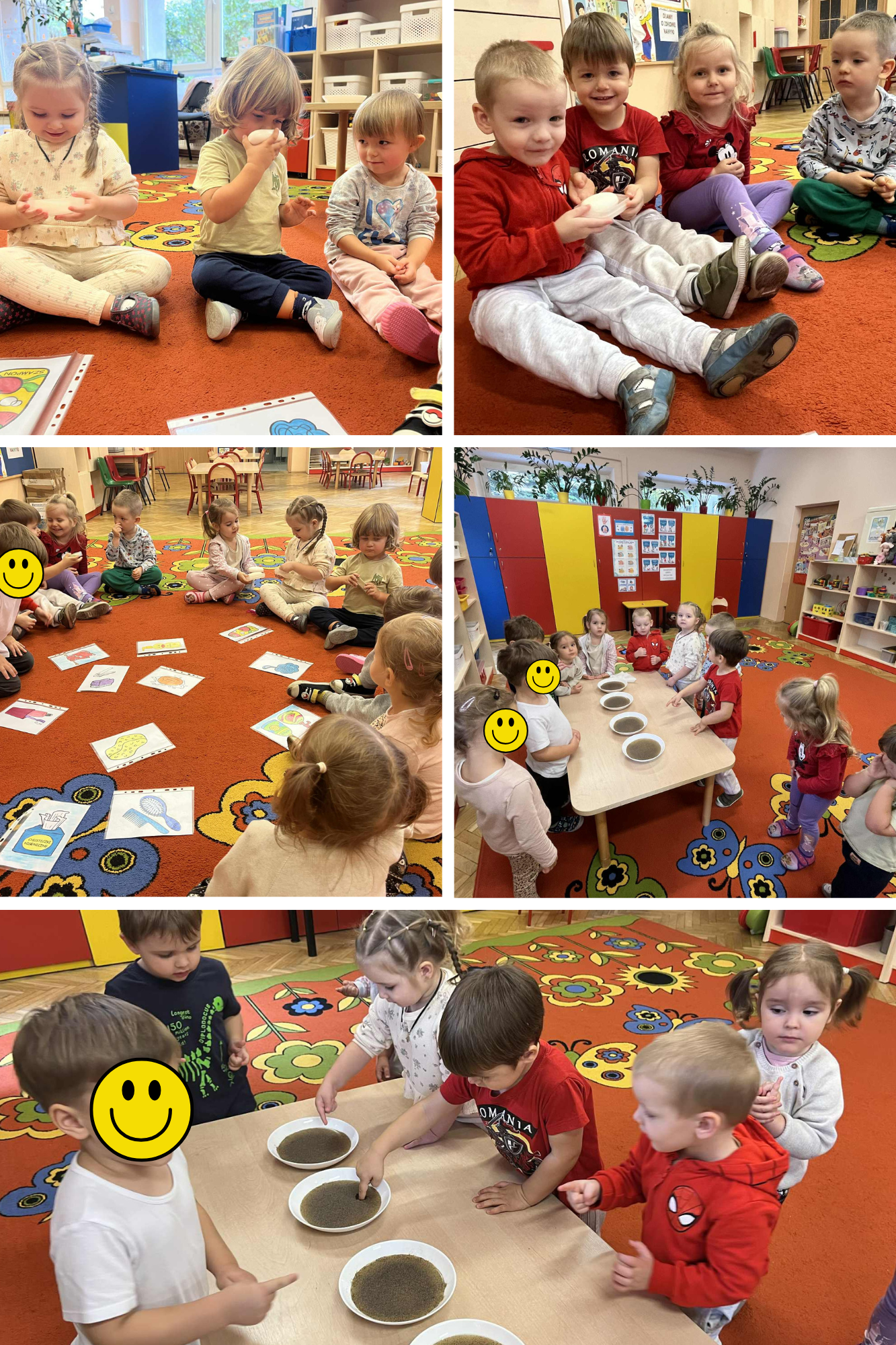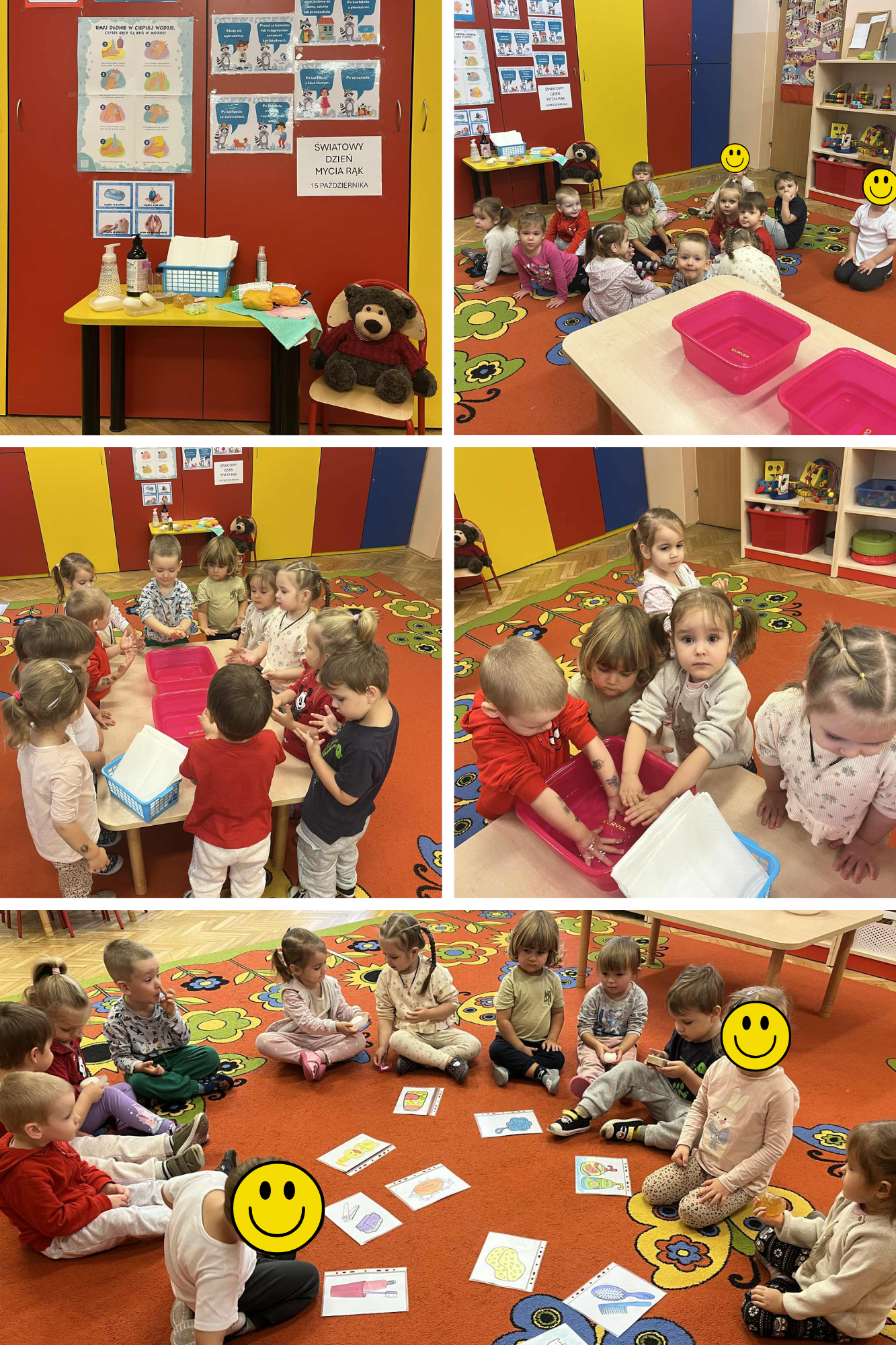 15 października dzieci z grupy „Krasnoludków” obchodziły „Światowy Dzień Mycia Rąk”, w ramach realizacji ogólnopolskiego programu edukacyjnego „Rok z Higieną Velvet”. Dzień ten ustanowiony został, aby podkreślić ogromne znaczenie mycia rąk wodą z mydłem. Dlatego też najmłodsze przedszkolaki zapoznały się z zasadami kiedy i w jaki sposób należy myć ręce oraz poznały kosmetyki i akcesoria służące do utrzymania higieny rąk. Dodatkowo dzieci uczestniczyły w zabawach sensorycznych z różnorodnymi mydłami. Eksperymenty z brokatem i pieprzem posłużyły do wizualizacji, jak łatwo roznoszą się zarazki i jak ważne jest używanie mydła.