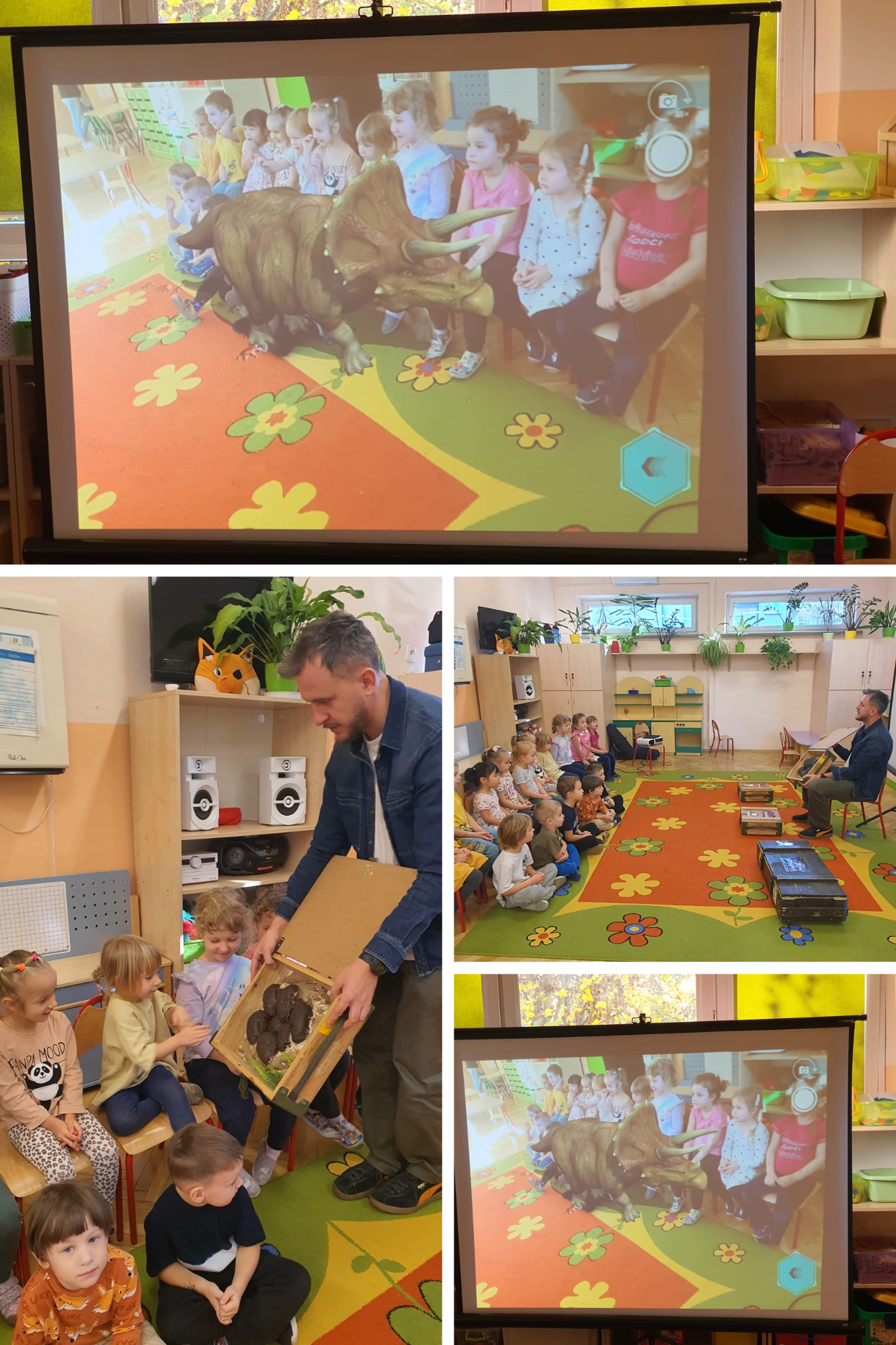 23 października wszystkie grupy przedszkolne uczestniczyły w warsztatach przyrodniczych pt.,,Dinozaury w przedszkolu”. Prowadzący podczas warsztatów zabrał nasze przedszkolaki w cudowną podróż po krainie dinozaurów. Przygotowane i zaprezentowane pomoce dydaktyczne, skompletowane eksponaty pozwoliły, aby dzieci poczuły się jak prawdziwi paleontolodzy. Prowadzący warsztaty pięknie opowiadał, angażując dzieci do aktywnego uczestnictwa. Na koniec zajęć została przeprowadzona projekcja "Żywych Dinozaurów". Ożyły one dzięki specjalnemu oprogramowaniu i wykorzystaniu nowoczesnych technik audiowizualnych, które pozwoliły przenieść dinozaury do otaczającej nas rzeczywistości, a dzieciom poczuć się jak w parku jurajskim. Dziękujemy za wspaniałe spotkanie i niesamowite przeżycia!
