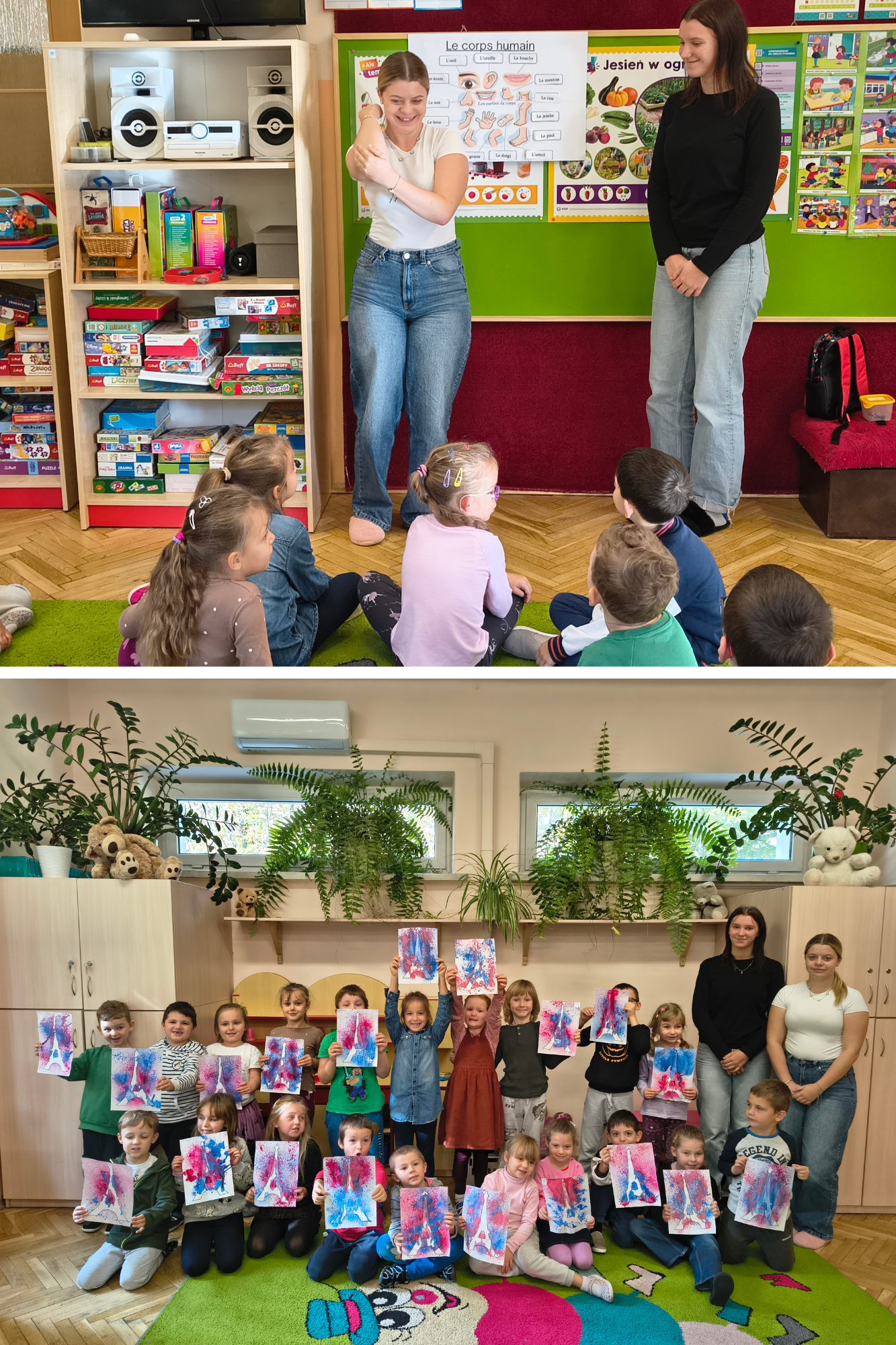 Od 13 do 25 marca 2023 roku, grupa „Tygryski” gościła Margo i Chloe w ramach projektu Erasmus. W trakcie 14 dniowego pobytu, wolontariuszki, a także dzieci miały okazję uczyć się od siebie nawzajem. Podczas zajęć plastycznych przygotowanych przez gości, przedszkolaki dowiedziały się, gdzie leży Francja, jakie miasto jest jej stolicą, a także jaki kolor ma francuska flaga narodowa. Miały również okazję porozumiewać się po francusku i wzbogacać słownictwo,które wcześniej poznawały na zajęciach dodatkowych z języka francuskiego.Na pamiątkę wspólnego czasu, wolontariuszki otrzymały upominki w postaci książeczki, składającej się z bajek rysowanych przez dzieci, a także, tradycyjnie, pamiątkowe albumy o Krakowie.